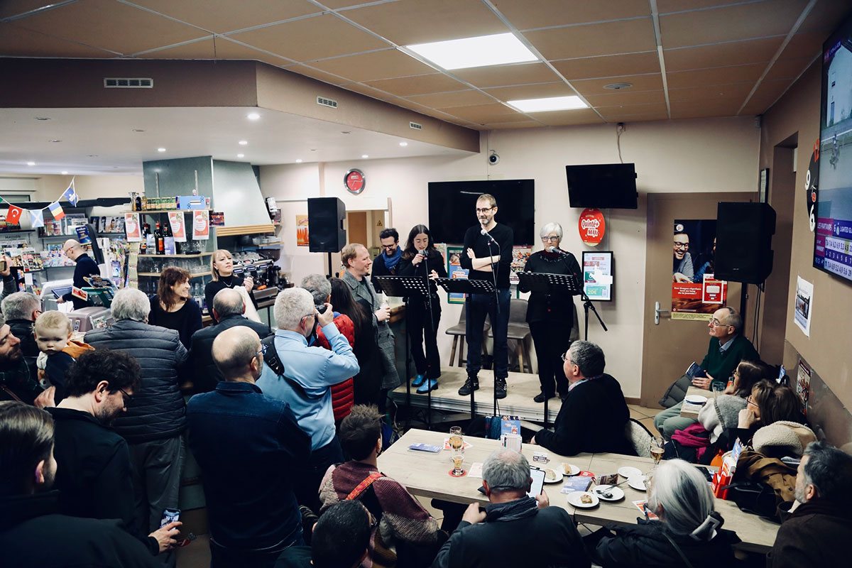 Le metteur en scène Jean Boillot a mis en voix – accompagné d’interprètes – les textes créées à Thil et les a porté à la scène au Café Le Penalty, le 6 décembre 2024.